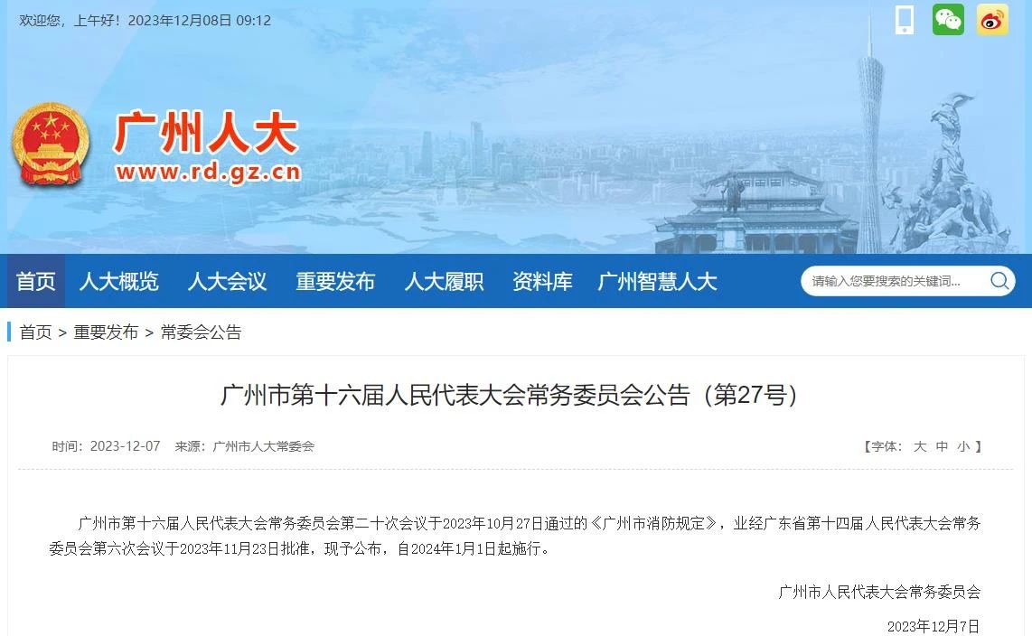廣東省第十四屆人民代表大會常務委員會第六次會議審查了廣州市人民代表大會常務委員會報請批準的《廣州市消防規定》,該規定與憲法、法律、行政法規和本省的地方性法規不抵觸,決定予以批準,由廣州市人民代表大會常務委員會公布施行。