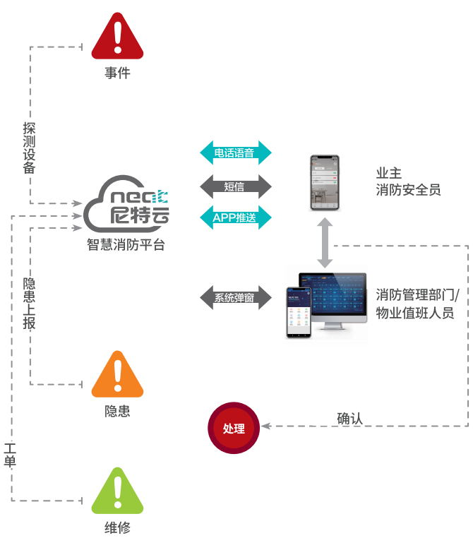 針對家庭消防安全隱患,尼特打造了家庭智慧消防解決方案,通過安裝家用獨立式感煙探測器、家用獨立可燃氣體探測器、家用智能斷路器等前段感知設備,對家庭內的廚房、客廳、臥室等房間進行實時火災監測,借助物聯網信號將火警信息上傳到物業監管平臺或用戶的小尼平安手機APP上,第一時間進行現場復核,壓縮火災處置時間,做出有效應對,避免出現小火引發大災,進一步提高家庭用戶火災預警、防控能力。