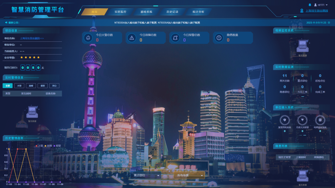 根據(jù)消防用水系統(tǒng)的規(guī)范標(biāo)準(zhǔn)要求,設(shè)置水位、壓力、傾斜角度等報(bào)警閾值,一旦高于報(bào)警上限或低于報(bào)警下限,系統(tǒng)能及時(shí)收到報(bào)警信息(時(shí)間、類(lèi)型、地點(diǎn)等)。