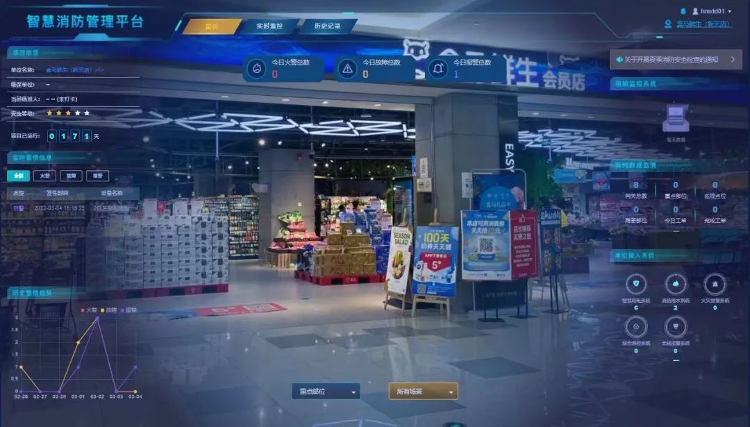尼特云智慧消防管理平臺支持快速接入商超內原有視頻及消防物聯感知設備,對消防安全系統等進行實時監控,“一張圖”掌握連鎖商超整套火災風險情況;