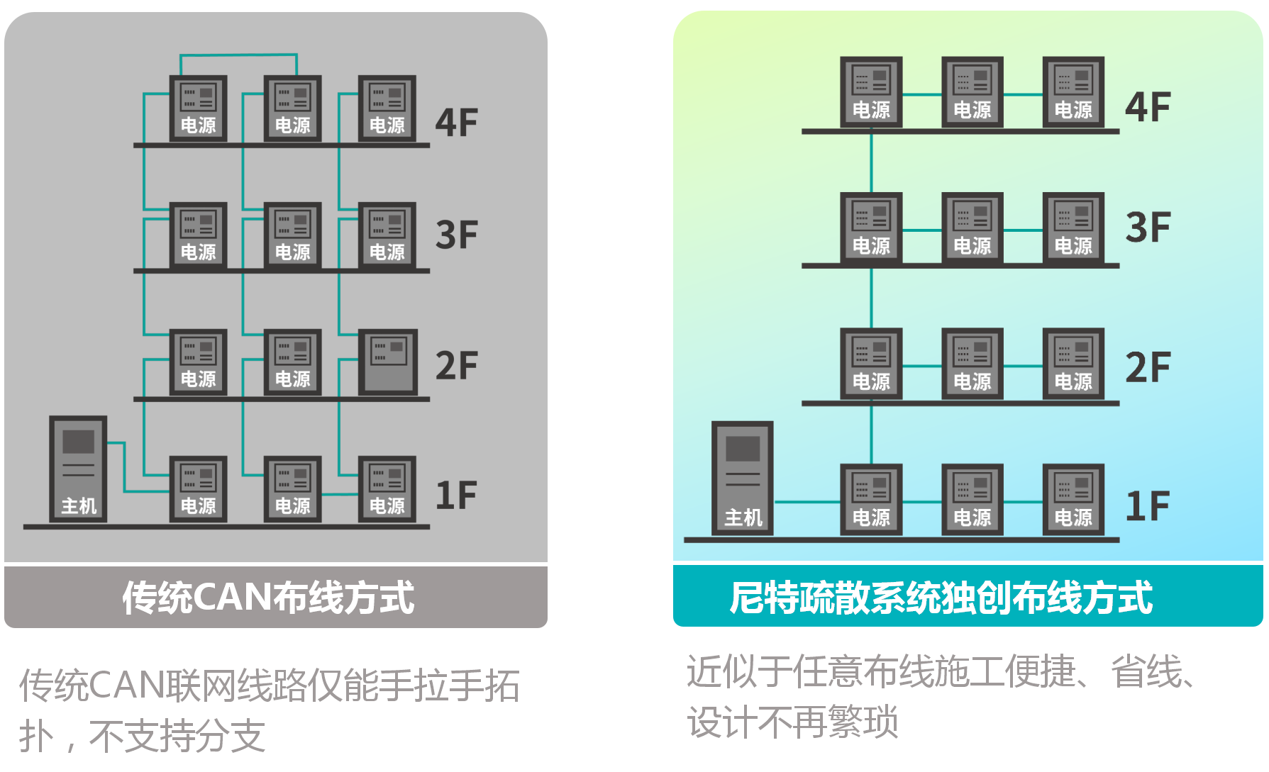 03以獨創的三級二分支CAN聯網方式,便于主機、電源位置自由布線,為園區高層建筑內設備聯網節省了大量線材,大大降低了施工難度。