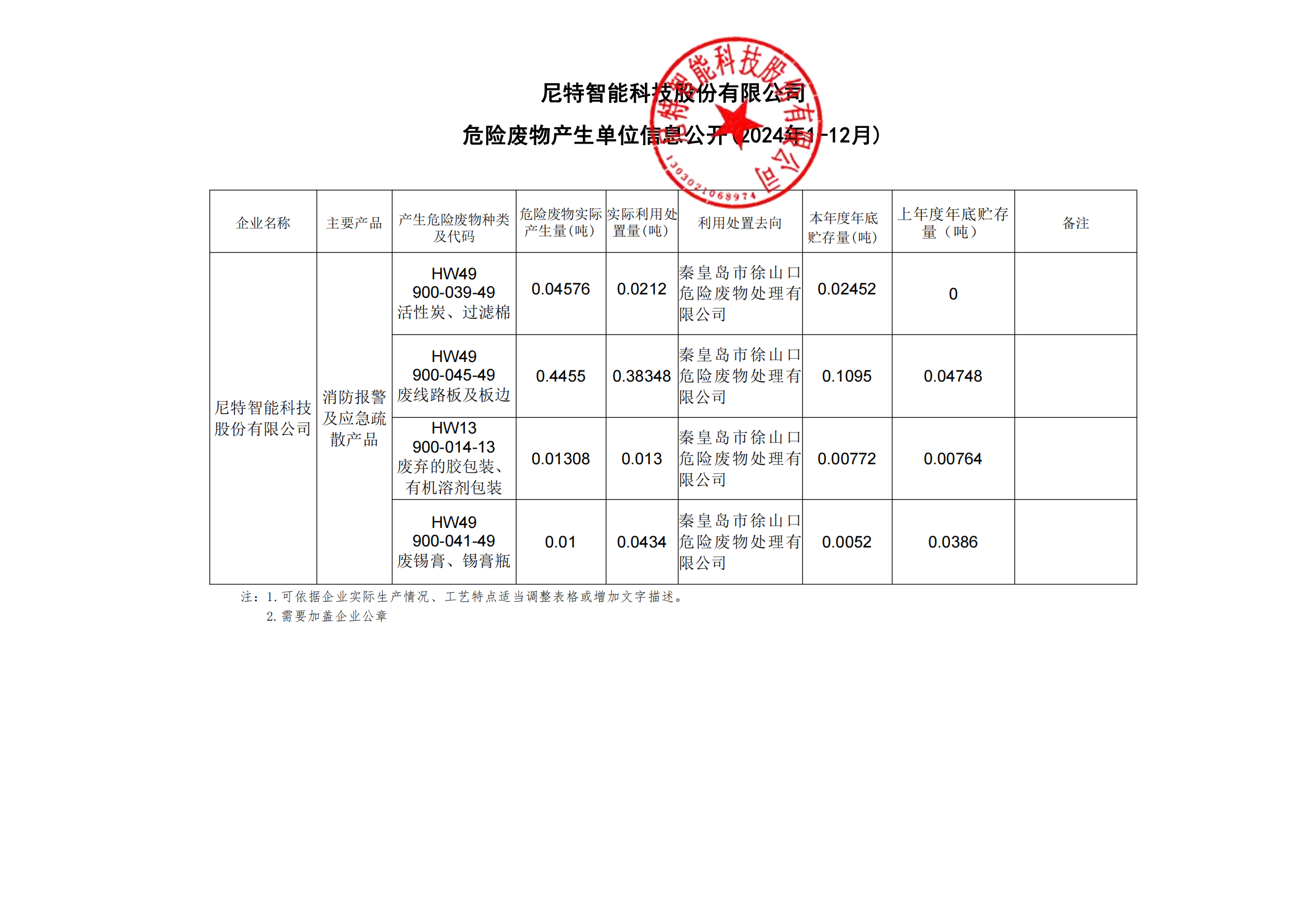 尼特智能科技股份有限公司 危險廢物產生單位信息公開(2024年1-12月)
