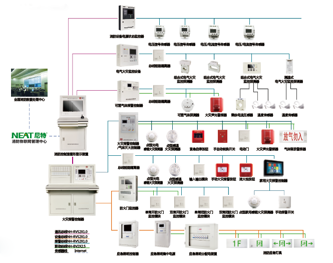 目前,尼特推出的消防電氣系統包括:火災自動報警及消防聯動控制系統、氣體滅火控制系統、電氣火災監控系統、可燃氣體探測報警系統、防火門監控系統、消防應急照明及疏散指示系統、消防設備電源監控系統、家用火災安全系統和消防物聯網監控系統。