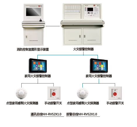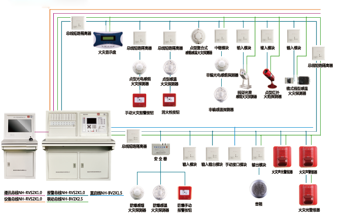 系統以NT8001火災報警控制器和NT8012消防控制室圖形顯示裝置為核心,報警總線采用成熟的FT-BUS全數字總線技術,系統內設備總線采用標準CAN總線通信協議。圖形顯示裝置兼容標準RS232/RS485通訊接口,可實現與尼特所有消防電氣系統的連接。系統采用多種自測試、自診斷技術,具有構成完整、配置靈活和運行可靠的特點。