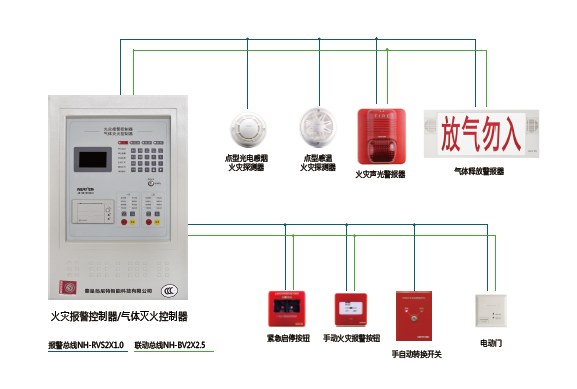 系統以NT8031火災報警控制器/氣體滅火控制器為核心,可以獨立配接感煙探測器和感溫探測器,共兩個分區,每個分區可接100個總線設備。可實現與火災報警控制器通過CAN總線通訊。可控制七氟丙烷、氣溶膠、二氧化碳等氣體滅火設備。