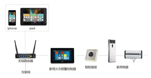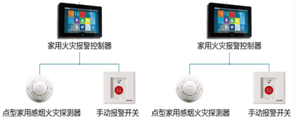系統由火災報警控制器、圖形顯示裝置、家用火災報警控制器、點型家用感煙火災探測器和手動報警開關組成。