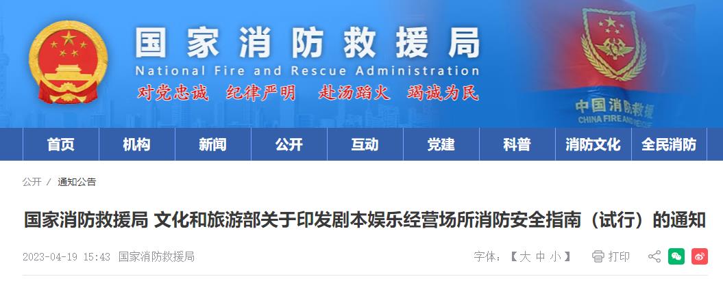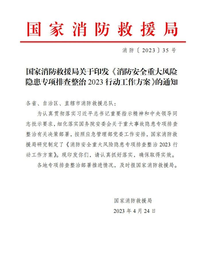 國家消防救援局關于印發 《消防安全重大風險隱患專項排查整治2023行動工作方案》 的通知 ? 4月24日,國家消防救援局印發工...